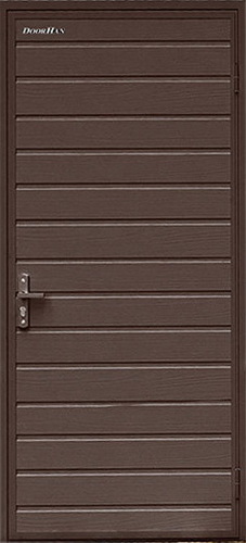 Наружная часть двери выполнена в дизайне "Доска" и имеет структуру "под дерево". Внутренняя часть - "Гофра" с текстурой "стукко"
