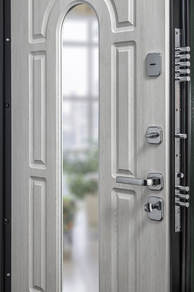 ОписаниеСтальной дверной блок произведен на уникальных автоматизированных линиях и роботизированных комплексах ведущих зарубежных производителейКачествоСертифицирован для РФ по ГОСТ 31173-2016. Наивысшие классы по эксплуатационным характеристикам (1) и прочности (М5). Сертификат POCC RU.AM05.H03178ОсобенностиЦельногнутая конструкция полотна и закрытый цельнокатаный профиль коробки. Стабильно точные геометрические показатели, которые обеспечиваются высокой степенью автоматизации и роботизации производстваМарка сталиВысококачественная конструкционная углеродистая сталь (08пс)ОкраскаИндустриальная полиэфирная порошковая краска с предварительной антикоррозийной обработкой (фосфатированием)Отделка снаружиДекоративная панель с возможностью замены. Толщина 18 мм, ВинилОтделка внутриДекоративная панель с возможностью замены. Толщина 22 мм, Эко Шпон (Германия, Южная Корея), зеркало "Reflex"РегулировкаДверь укомплектована эксцентриком, правильная регулировка которого обеспечивает легкость открывания двери и беспрепятственную работу замковых механизмовУплотнениеТри контура высококачественного EPDM-уплотнителя (Швеция)УсилениеЧетыре вертикально-горизонтальных усиливающих омега-профиля (ребра) создают единую монолитную жесткость и прочность конструкции. Сверхпрочная конструкция «6x2» - двойная толщина стали профиля полотна, двух контуров коробки, в зонах замка и петель. Дополнительную стойкость ко взлому обеспечивают два противосъемных штыря с цинковым покрытием (для защиты металла от коррозии)Утепление полотнаВнутри полотна установлена конструкционная теплоизоляционная панель SIP (Structural Insulated Panel), которая не только обеспечивает необходимую теплоизоляцию, но и придает дополнительную жесткость и прочность дверному блокуУтепление коробкиВлагостойкая теплоизоляционная плита KNAUF ThermКреплениеДвери крепятся анкерными болтами через коробку (8 отверстий) или с использованием монтажных пластин (6 шт. в комплекте)Внимание!Дверь предназначена для установки в тамбуре или под защитным козырькомТолщина полотна/коробки, мм98/98Толщина стали полотна/коробки, мм1.2Ширина наличника, мм60Размер проема в свету, см193/76Масса нетто, кг113.8ПетлиДве петли Сombiarialdo 140*20 мм на опорном подшипнике с открыванием на 120° (Италия)Нижний замокBorder K 4-3 с 3 ригелями диаметром 17 мм, массивные общие планки (ответная планка из нержавеющей стали), 4-й (высший) классВерхний замокBorder K 8-6 с 5 ригелями диаметром 18 мм (один из ригелей с каленой вставкой), 5 ключей 120 мм, 4-й (высший) классЦилиндрSM-95-65/30 ключ-фиксатор NI Никель, 5 ключей в комплекте (либо аналоги)РучкаTOR CP ХромНочная задвижкаЗ-60 Б (вкладная)ГлазокVIEWER4 DVQ 70х130/16 CP Хром со шторкой и углом обзора 180°ПрочееЗаглушки для монтажных отверстий, чашки для противосъемных штырей