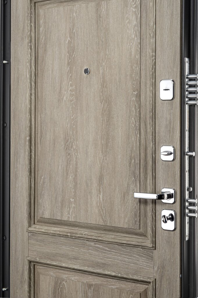 ОписаниеСтальной дверной блок произведен на уникальных автоматизированных линиях и роботизированных комплексах ведущих зарубежных производителейКачествоСертифицирован для РФ по ГОСТ 31173-2016. Наивысшие классы по эксплуатационным характеристикам (1) и прочности (М5). Сертификат POCC RU.AM05.H03178ОсобенностиЦельногнутая конструкция полотна и закрытый цельнокатаный профиль коробки. Стабильно точные геометрические показатели, которые обеспечиваются высокой степенью автоматизации и роботизации производстваМарка сталиВысококачественная конструкционная углеродистая сталь (08пс)ОкраскаИндустриальная полиэфирная порошковая краска с предварительной антикоррозийной обработкой (фосфатированием)Отделка снаружиДекоративная панель с возможностью замены. Толщина 18 мм, Эко Шпон (Германия, Южная Корея)Отделка внутриДекоративная панель с возможностью замены. Толщина 22 мм, Эко Шпон (Германия, Южная Корея)РегулировкаДверь укомплектована эксцентриком, правильная регулировка которого обеспечивает легкость открывания двери и беспрепятственную работу замковых механизмовУплотнениеТри контура высококачественного EPDM-уплотнителя (Швеция)УсилениеЧетыре вертикально-горизонтальных усиливающих омега-профиля (ребра) создают единую монолитную жесткость и прочность конструкции. Сверхпрочная конструкция «6x2» - двойная толщина стали профиля полотна, двух контуров коробки, в зонах замка и петель. Дополнительную стойкость ко взлому обеспечивают два противосъемных штыря с цинковым покрытием (для защиты металла от коррозии)Утепление полотнаВнутри полотна установлена конструкционная теплоизоляционная панель SIP (Structural Insulated Panel), которая не только обеспечивает необходимую теплоизоляцию, но и придает дополнительную жесткость и прочность дверному блокуУтепление коробкиВлагостойкая теплоизоляционная плита KNAUF ThermКреплениеДвери крепятся анкерными болтами через коробку (8 отверстий) или с использованием монтажных пластин (6 шт. в комплекте)Внимание!Дверь предназначена для установки в тамбуре или под защитным козырькомТолщина полотна/коробки, мм98/98Толщина стали полотна/коробки, мм1.2Ширина наличника, мм60Размер проема в свету, см193/76Масса нетто, кг108ПетлиДве петли Сombiarialdo 140*20 мм на опорном подшипнике с открыванием на 120° (Италия)Нижний замокBorder K 4-3 с 3 ригелями диаметром 17 мм, массивные общие планки (ответная планка из нержавеющей стали), 4-й (высший) классВерхний замокBorder K 8-6 с 5 ригелями диаметром 18 мм (один из ригелей с каленой вставкой), 5 ключей 120 мм, 4-й (высший) классЦилиндрSM-95-65/30 ключ-фиксатор NI Никель, 5 ключей в комплекте (либо аналоги)РучкаTOR CP ХромНочная задвижкаЗ-60 Б (вкладная)Глазок6016/70-110 CR Хром со шторкой и углом обзора 180°ПрочееЗаглушки для монтажных отверстий, чашки для противосъемных штырей