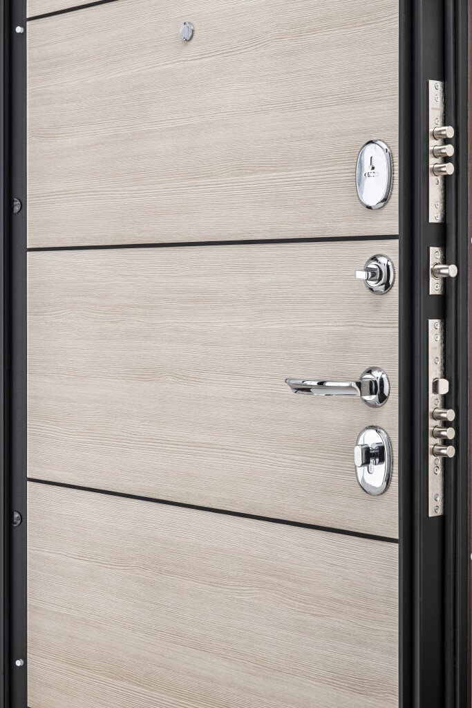 ОписаниеДверной стальной однопольный блок с открыванием наружу. Произведен на уникальных автоматизированных линиях и роботизированных комплексах ведущих зарубежных производителей. Поставляется с правым и левым открываниемКачествоСертифицирован для РФ по ГОСТ 31173-2016. Наивысшие классы по эксплуатационным характеристикам (1) и прочности (М5). Сертификат POCC RU.AM05.H03178ОсобенностиЦельногнутая конструкция полотна и закрытый цельнокатаный профиль коробки. Стабильно точные геометрические показатели, которые обеспечиваются высокой степенью автоматизации и роботизации производстваМарка сталиВысококачественная конструкционная углеродистая сталь (08пс)ОкраскаИндустриальная полиэфирная порошковая краска с предварительной антикоррозийной обработкой (фосфатированием)Отделка снаружиДекоративная панель с возможностью замены. Толщина 10 мм, ВинилОтделка внутриДекоративная панель с возможностью замены. Толщина 24 мм, Эко Шпон (Германия, Южная Корея), декоративные молдингиРегулировкаДверь укомплектована эксцентриком, правильная регулировка которого обеспечивает легкость открывания двери и беспрепятственную работу замковых механизмовУплотнениеТри контура высококачественного EPDM-уплотнителя (Швеция)УсилениеЧетыре вертикально-горизонтальных усиливающих омега-профиля (ребра) создают единую монолитную жесткость и прочность конструкции. Сверхпрочная конструкция «6x2» - двойная толщина стали профиля полотна, двух контуров коробки, в зонах замка и петель. Дополнительную стойкость ко взлому обеспечивают два противосъемных штыря с цинковым покрытием (для защиты металла от коррозии)Утепление полотнаВнутри полотна установлена конструкционная теплоизоляционная панель SIP (Structural Insulated Panel), которая не только обеспечивает необходимую теплоизоляцию, но и придает дополнительную жесткость и прочность дверному блокуКреплениеДвери крепятся анкерными болтами через коробку (8 отверстий) или с использованием монтажных пластин (6 шт. в комплекте)Внимание!Дверь предназначена для установки в тамбуре или под защитным козырькомТолщина полотна/коробки, мм93/90Толщина стали полотна/коробки, мм1.2Ширина наличника, мм60Размер проема в свету, см193/76Масса нетто, кг93.8Петли140*20 мм на опорном подшипнике, обеспечивают открывание на 180°, 2 штНижний замокBorder G 4-3 Э с 3 ригелями диаметром 16 мм, 4-й (высший) классВерхний замокBorder G 8-6 Э с 3 ригелями диаметром 16 мм, 4 ключа 97 мм в комплекте, 4-й (высший) классЦилиндрBravo AF-100-50/50 ключ-фиксатор C Хром, 5 ключей в комплектеРучкаA-493 C ХромНочная задвижкаЗ-60 НикельГлазок6016/50-90 CR Хром со шторкой и углом обзора 180°ПрочееЗаглушки для монтажных отверстий, чашки для противосъемных штырей