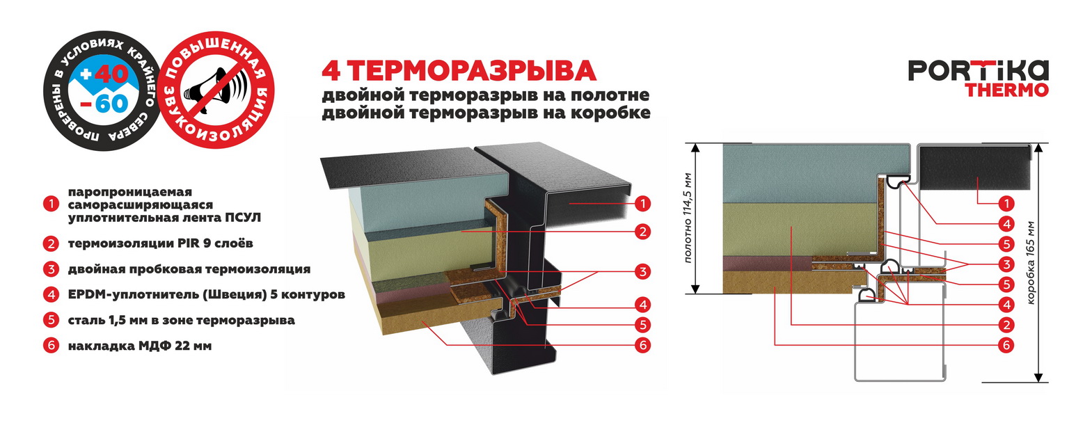 ОписаниеСтальной дверной блок с терморазрывом. Подходит для установки "улица/дом" без дополнительной защиты. Повышенные характеристики звукоизоляции. Открывание наружу. Произведен на уникальных автоматизированных линиях и роботизированных комплексах ведущих зарубежных производителейКачествоСертифицирован для РФ по ГОСТ 31173-2016. Наивысшие классы по эксплуатационным характеристикам (1) и прочности (М5). Сертификат POCC RU.AM05.H03178ОсобенностиЧЕТЫРЕ!!! КОНТУРА ТЕРМОРАЗРЫВА (2 на полотне и 2 на коробе), в то время как у других производителей максимум 2 контура терморазрыва, что может вызвать промерзание. Четыре контура терморазрыва гарантированно обеспечивают отделение зон холод/тепло, что в свою очередь исключает образование конденсата и соприкосновение металла по периметру двери (пробка + уплотнитель). Цельногнутая конструкция полотна и цельногнутый открытый профиль коробки из металла 1,2 мм, зона терморазрыва полотно-коробка из металла 1,5 мм. Стабильно точные геометрические показатели, которые обеспечиваются высокой степенью автоматизации и роботизации производстваМарка сталиВысококачественная конструкционная углеродистая сталь (08пс)ОкраскаИндустриальная полиэфирная порошковая краска с предварительной антикоррозийной обработкой (фосфатированием)Отделка снаружиМеталлофиленкаОтделка внутриДекоративная панель с возможностью замены. Толщина 22 мм, Эко ШпонРегулировкаДверь укомплектована эксцентриком, правильная регулировка которого обеспечивает легкость открывания двери и беспрепятственную работу замковых механизмовУплотнениеПЯТЬ!!! КОНТУРОВ высококачественного EPDM-уплотнителя (Швеция) + демпферная лентаУсилениеЧетыре усиливающих омега-профиля и три дополнительных ребра создают единую монолитную жесткость. Сверхпрочная конструкция 6х2: двойная толщина стали полотна профиля, двух контуров коробки и в зоне петель + тройная толщина стали в зонах замка. Дополнительную стойкость ко взлому обеспечивают два противосъемных штыря с цинковым покрытием (для защиты металла от коррозии)Утепление полотнаДЕВЯТЬ!!! СЛОЕВ ТЕРМОИЗОЛЯЦИИ (PIR-плита с алюминиевой фольгой) обеспечивают надёжную звукоизоляцию и усиление прочности конструкции, а также обладают высокими теплоизолирующими свойствами + двойная пробковая термоизоляция 2х4 мм на полотне + двойная пробковая термоизоляция 2х4 мм на коробке + 5 контуров высококачественного EPDM-уплотнителя (Швеция) + демпферная лента + паропроницаемая саморасширяющаяся уплотнительная лента ПСУЛ в дверной коробке + минеральная вата Технониколь внутри рёбер жёсткости + фольгированный вспененный полиэтилен 5 мм в замковой частиКреплениеДвери крепятся анкерными болтами через коробку (6 отверстий) или с использованием монтажных пластинВнимание!Дверь обладает повышенной звукоизоляцией. Подходит для установки на улицуТолщина полотна/коробки, мм115/165Толщина стали полотна/коробки, мм1,2 (1,5 в зоне терморазрыва)Ширина наличника, мм60ПетлиПетли Сombi Arialdo 140*20 мм на опорном подшипнике (Италия), открывание 180°, 2 шт.Нижний замокBorder K 9-6 с 4 ригелями диаметром 18 мм (один из ригелей с каленой вставкой), 5 ключей 120 мм, 4-й (высший) классВерхний замокBorder K 8-6 с 5 ригелями диаметром 18 мм (один из ригелей с каленой вставкой), 5 ключей 120 мм, 4-й (высший) классРучкаTOR CP ХромНочная задвижкаИ-65 (вкладная)ГлазокНетПрочееЗамки