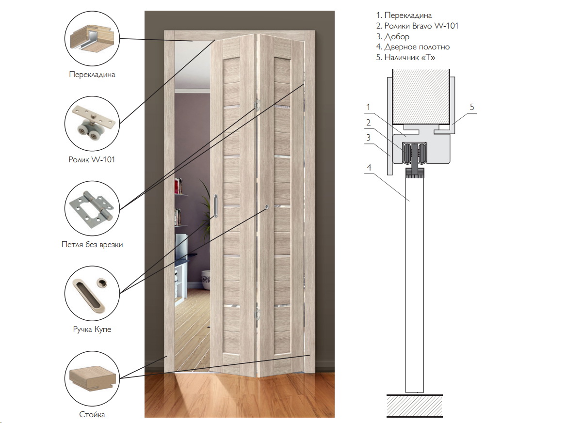 • 2 равных по ширине дверных полотна (35 или 40 см);• перекладину для складной двери в комплекте с верхней направляющей П-2 (100 см);