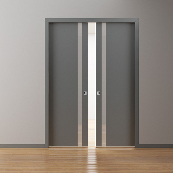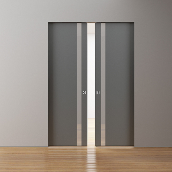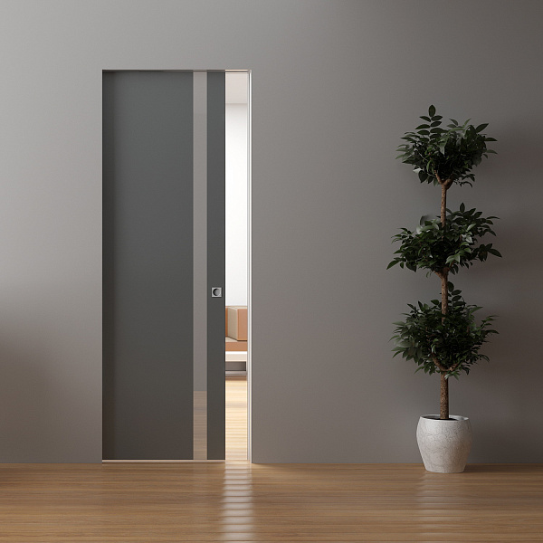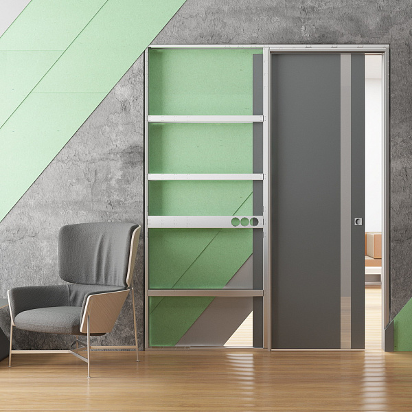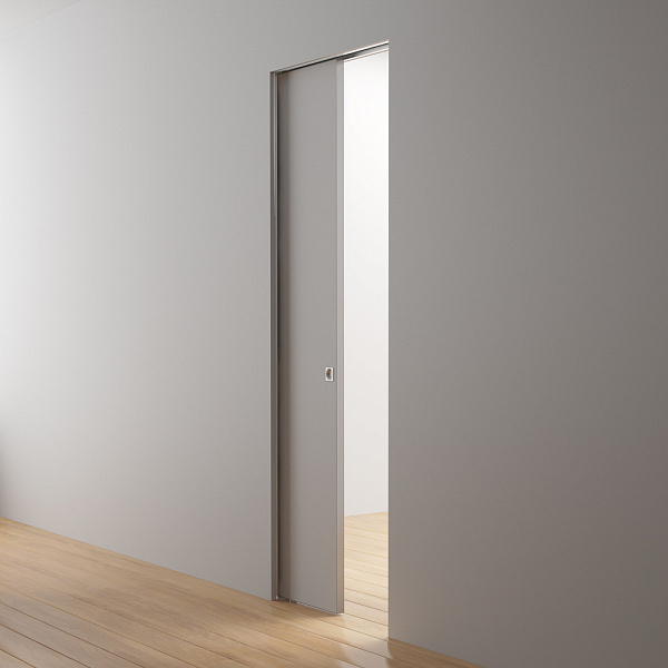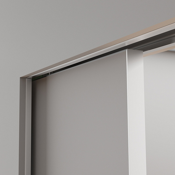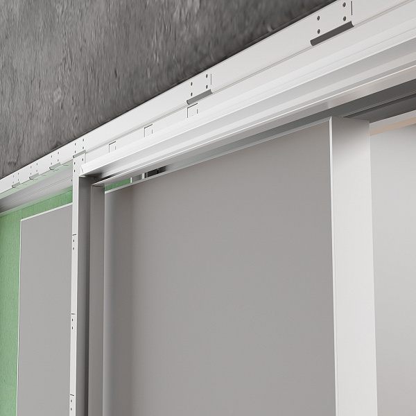 Специальный скрытый короб с раздвижной системой для установки дверных полотен устанавливается в проем в стене и обшивается гипсокартоном в 2 слоя (либо отделывается штукатуркой) для последующей отделки чистовыми отделочными материалами (краской, обоями, плиткой и т.п.)