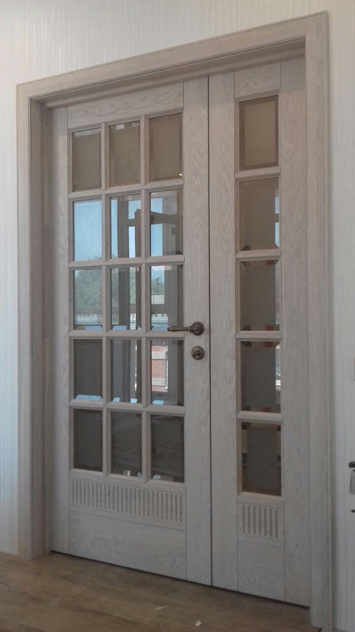 Межкомнатные двери из массива дуба Брянский лес, модель Премьер 2, цвет Дуб беленый, стекло белое 6 мм с фацетом.