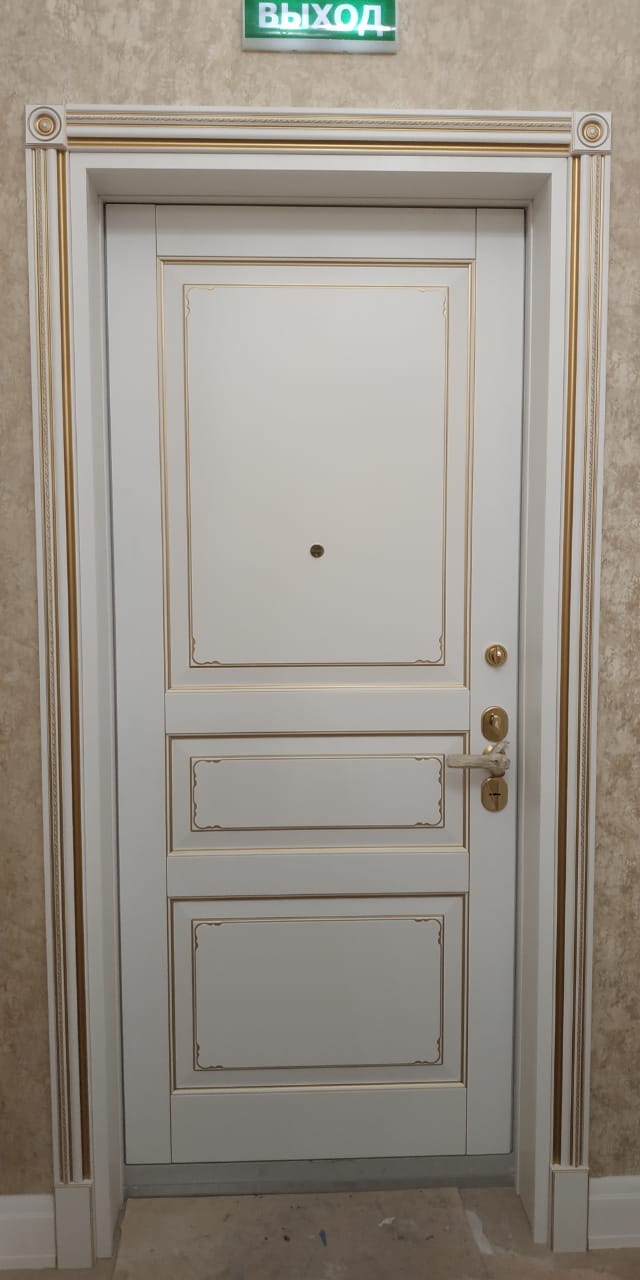 Внутренняя панель повторяет модель межкомнатной двери "Волховец Royal 6231", цвет - Белоснежный с позолотой